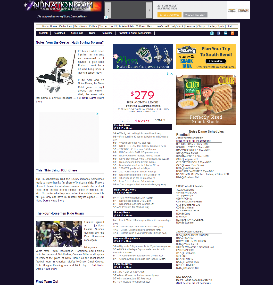 With the Pub and NDHoops running separately, SEE purchased the NDNation.com URL in May of 2000 to bring both sites together while adding a front page of news links, giving Fighting Irish fans a single place to go to get their news about Notre Dame and its sports teams.  Originally modeled off a smaller aggregator site, the structure changed over the years to accommodate the expanding technological capabilities and user palates.