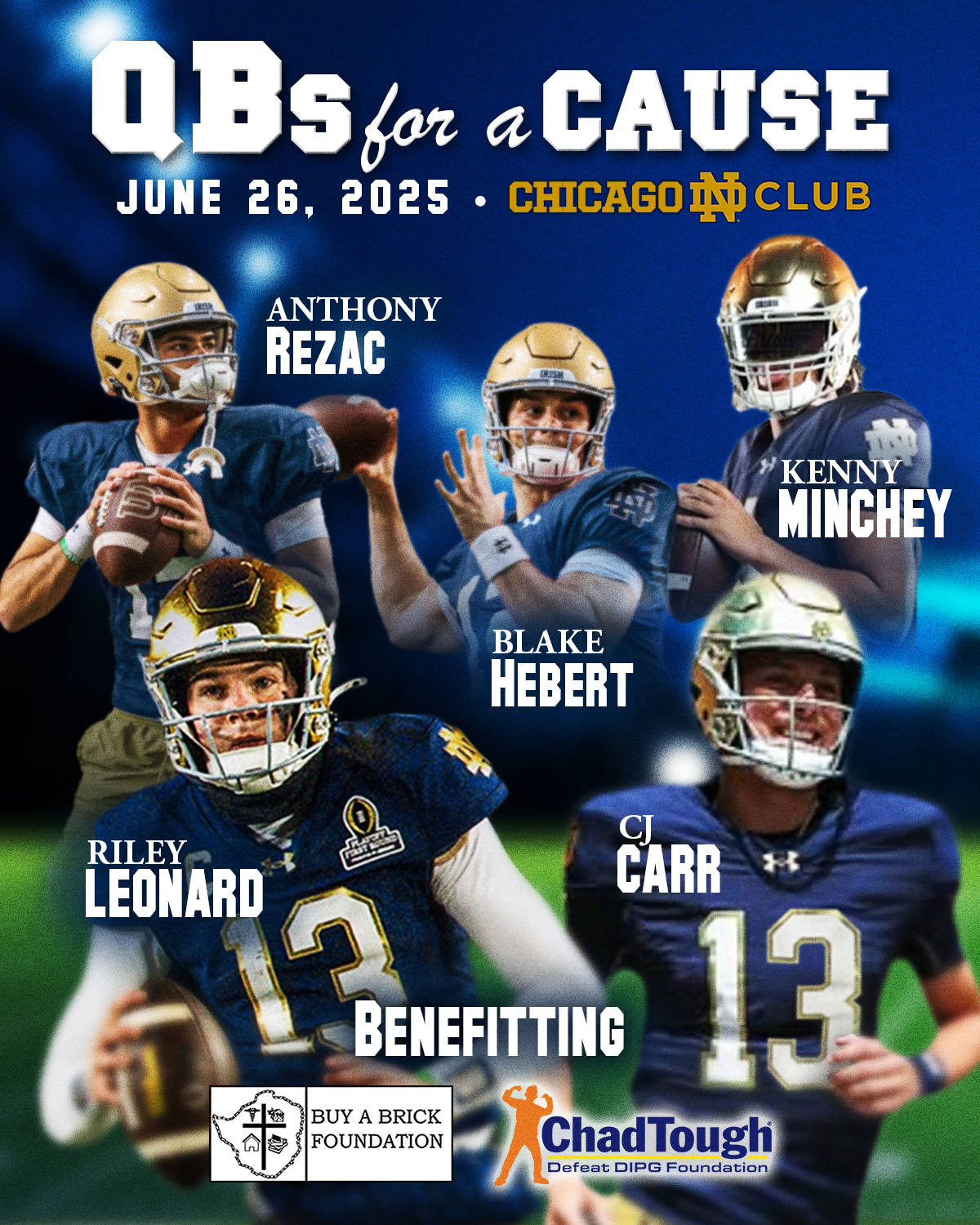 On June 26th, join current and former Irish signal-callers Riley Leonard, C.J. Carr, Kenny Minchey, Blake Hebert, and Anthony Rezac at QB’s For a Cause. This event, in conjunction with the Notre Dame Club of Chicago, takes place from 6-9pm at Wintrust’s Grand Banking Hall, 231 S. LaSalle Street in the South Loop.